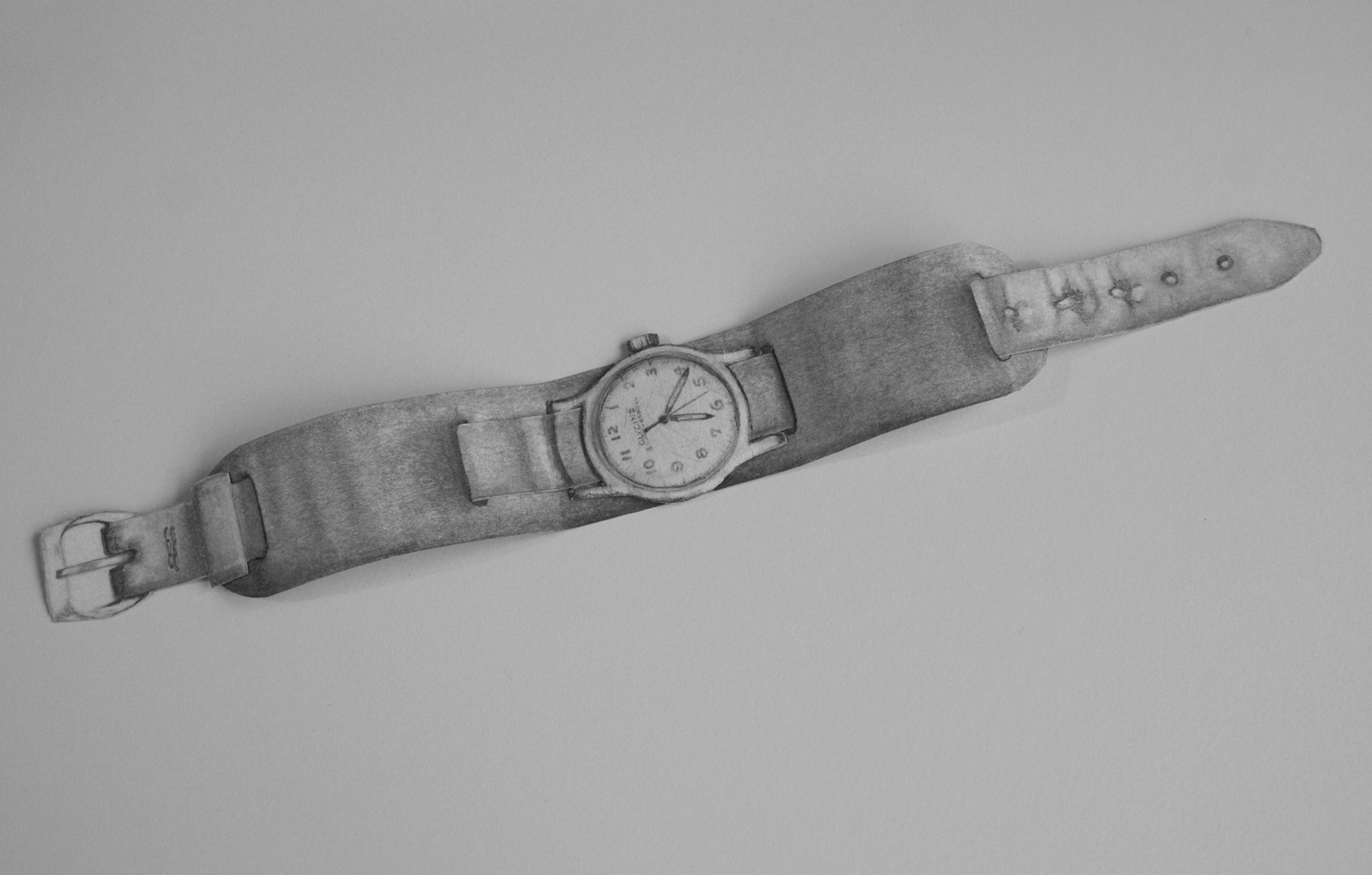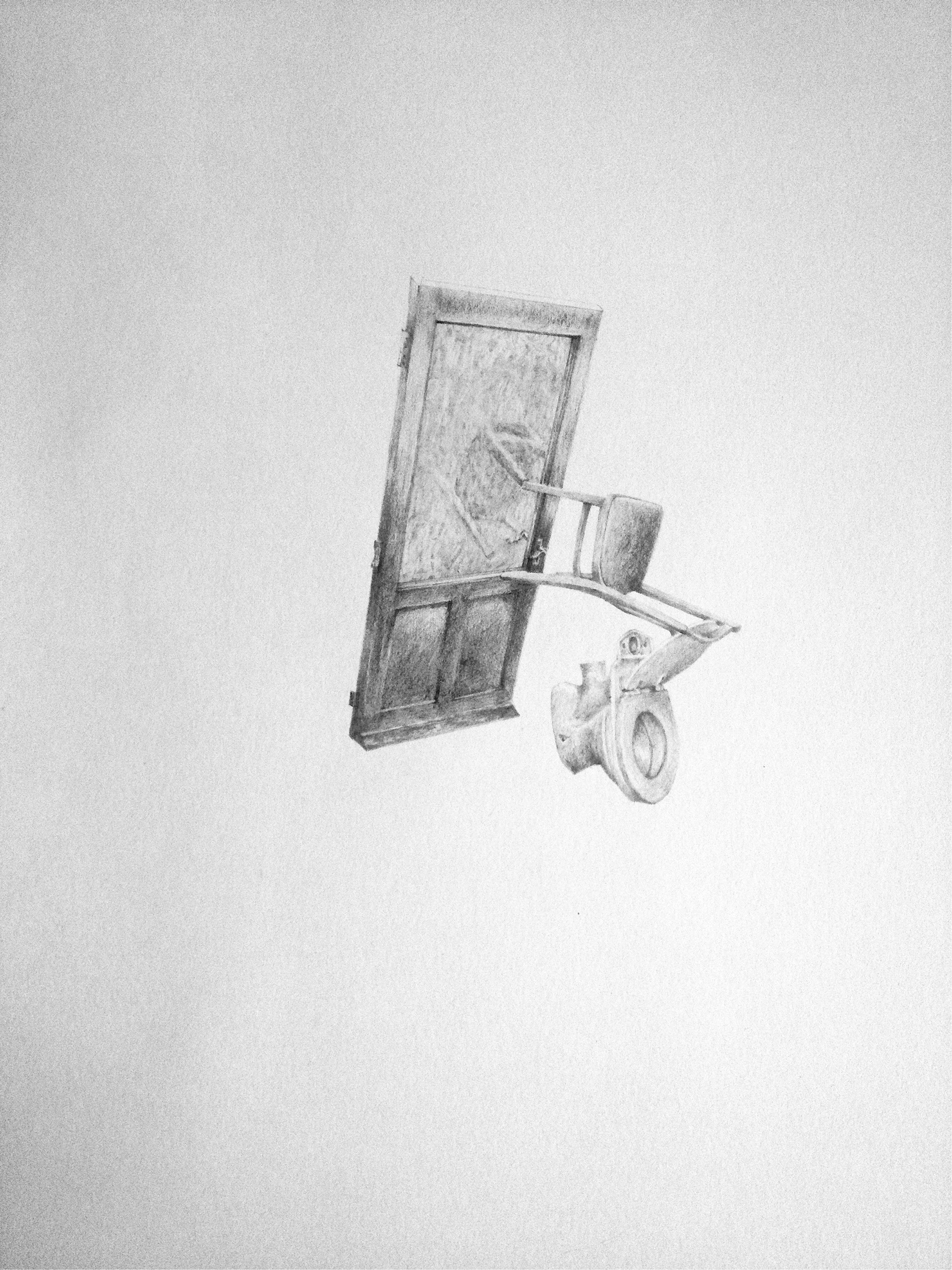 Through drawing, both Carole Cluer and Alan Baker invite the viewer to create narratives around the work. Carole Cluer’s work explores whether it is possible to create memories through the act of drawing. Carefully drawn from her imagination, various ephemera give weight to the unreal through trompe l’oeil style effects. Carole constructs an alternative future or past within various objects such as a hat, a coat or a wallet, each meticulously recreated by hand in pencil. Similarly, Alan Baker creates sculptural assemblages from objects kept around the house that are intended to trap animals. He then documents these items through the process of drawing. As part of his Trap and Snare series, Alan captures the tension between each of the delicately poised objects, exploring the boundary between where wild animals become domesticated or agricultural.