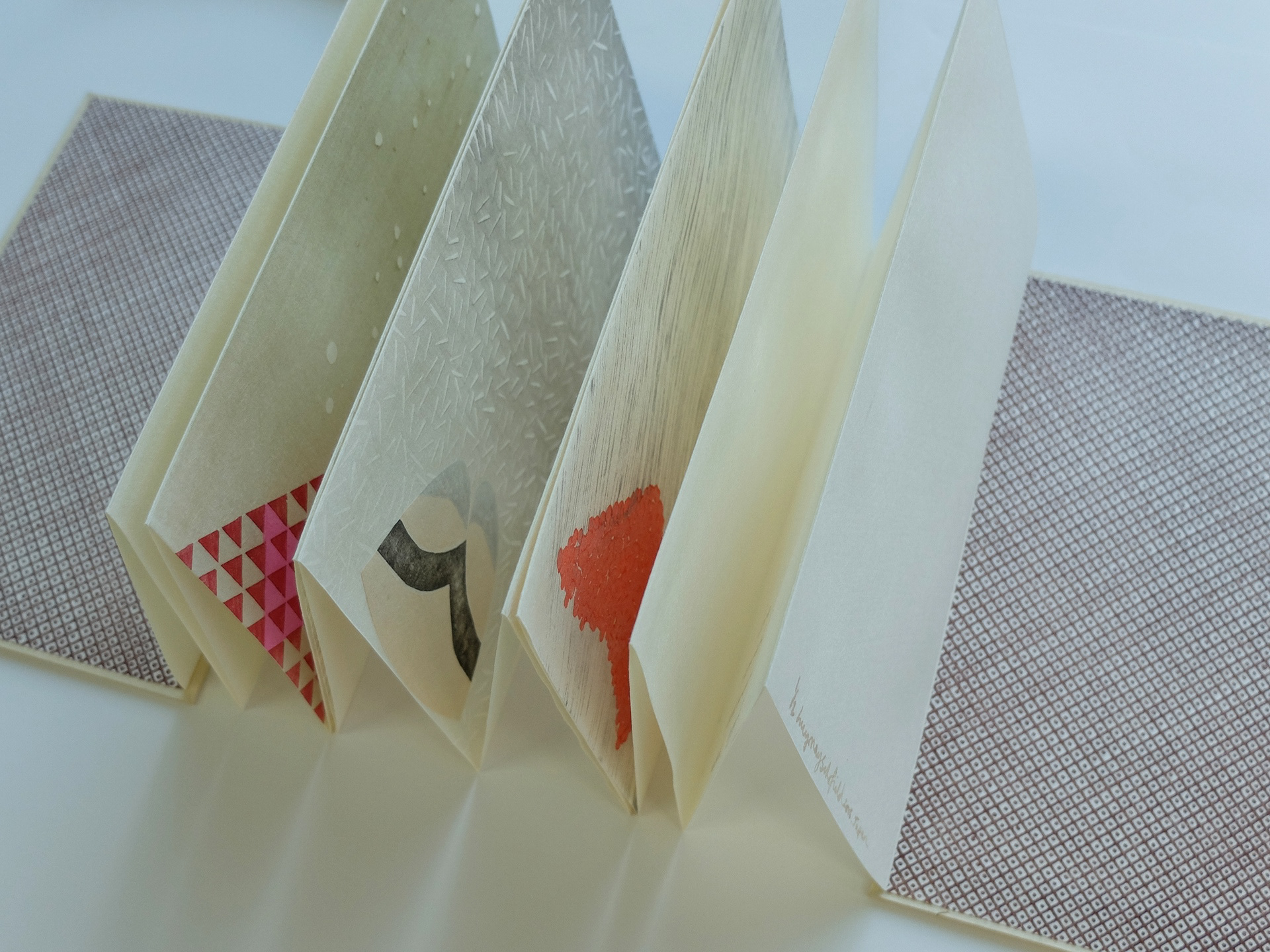 An accordion artist’s book containing 5 mokuhanga prints (Japanese water-based woodblock). Part of the series, ‘Each morning I wake to you’, each print ‘Love, Nourish, Between, Ash, Eggs’ is a reflection of the constant presence of Mount. Fuji alongside a reference to the relationships formed with five fellow artists during the ‘Mokuhanga Innovation Laboratory Artist’s Residency’ on Lake Kawaguchiko, Japan in May 2015. Five woodblock prints in watercolour on ‘Ozu’ washi, ‘Isetetsu’ Japanese woodblock printed endpapers, hardback covered with mokuhanga ‘ash’ print, hand coloured ‘Ozu’ washi bellyband slip case, 1st edition of 2 (VE - variation of endpapers)