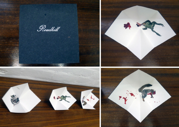 Origami folded watercolour prints of animal road kill punctuate the purified contentment of rural living, as gentle reminders of mortality. A book in memorandum - A series of 3, pigeon, frog and rabbit, each inkjet printed on Somerset enhanced paper and hand watercolour tinted, hardback cloth covered case with gold foil lettering.
