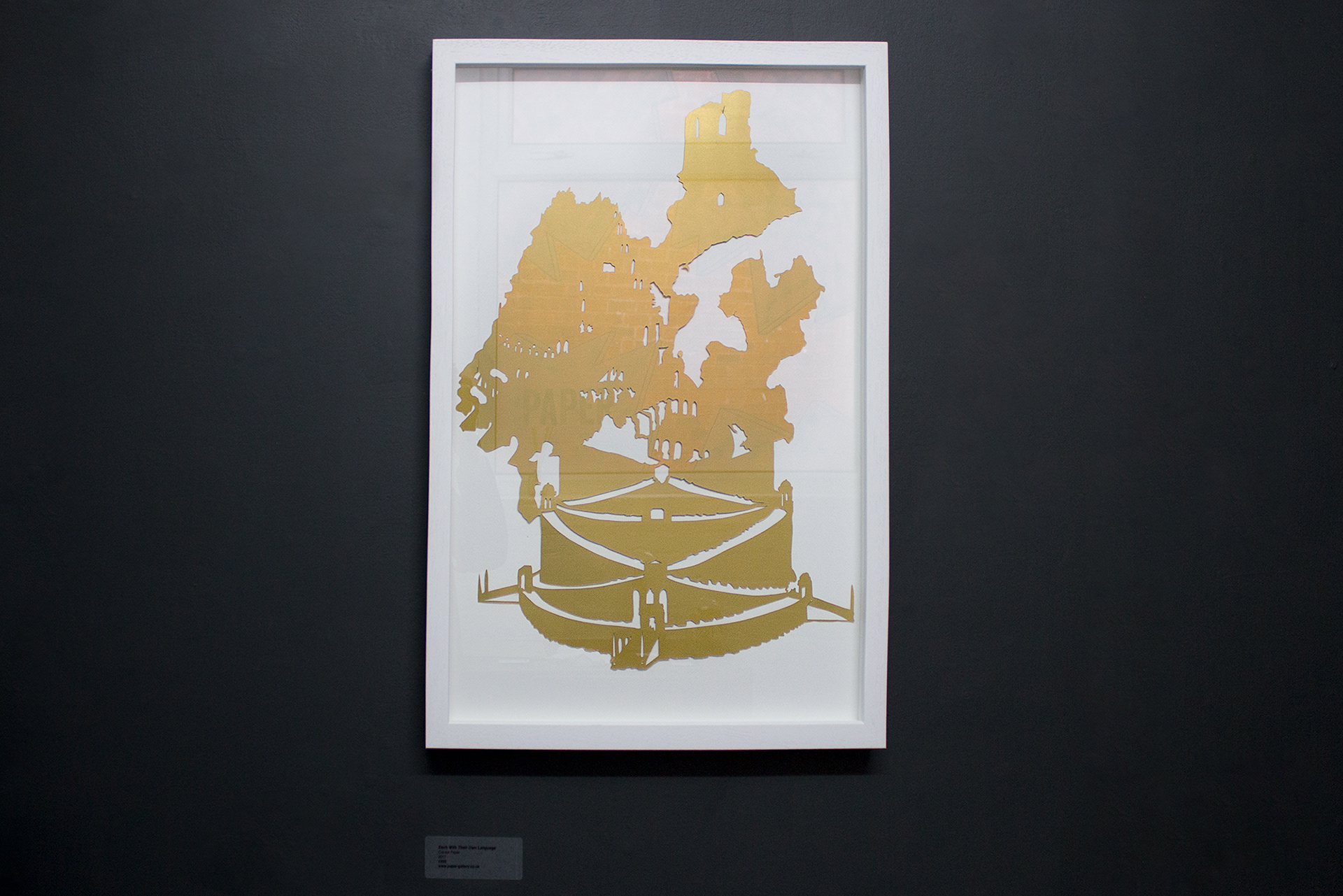 Tracey’s work appropriates representations of landscape by selecting and then layering together imagery found and collected from science fiction and romantic literature, the English landscape painting tradition, and heritage publications. The works are consequently delicate, precarious, and at times, in a part state of collapse. This precariousness speaks of our relationship with the natural environment, which we attempt to encapsulate and frame with constructs of identity, class, and ownership. To this end, the use of gold comes from an interest in history as a valorising force that engenders social and cultural connection and identity.